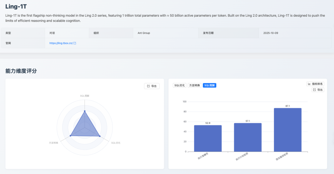 Ring-1T 在「SQL 优化」和「SQL 理解」维度展现了 更为均衡和稳健的综合能力,总分均进入榜单上游。