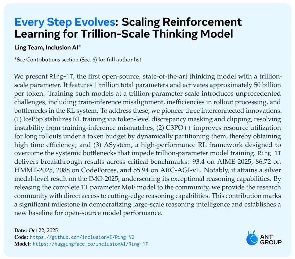 Ring-1T:一款基于 Ling 2.0 架构的思考模型,也是全球首个开源万亿参数思考模型。