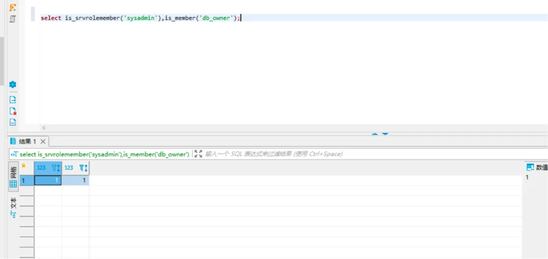 # 登录到 SQL Server 数据库中执行 select is_srvrolemember('sysadmin'),is_member('db_owner');