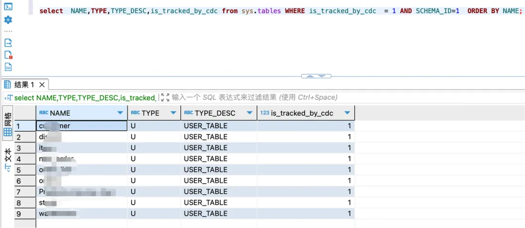 # 切换到待迁移的数据库中执行, ## 未开启的表 select NAME,TYPE,TYPE_DESC,is_tracked_by_cdc from sys.tables WHERE is_tracked_by_cdc = 0 AND SCHEMA_ID=1 ORDER BY NAME; ## 已开启的表 select NAME,TYPE,TYPE_DESC,is_tracked_by_cdc from sys.tables WHERE is_tracked_by_cdc = 1 AND SCHEMA_ID=1 ORDER BY NAME;