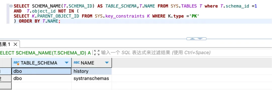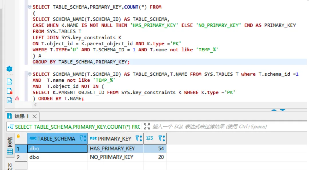 # 切换到待迁移数据库执行,主键表和无主键表数量检查示例 SELECT TABLE_SCHEMA,PRIMARY_KEY,COUNT(*) FROM ( SELECT SCHEMA_NAME(T.SCHEMA_ID) AS TABLE_SCHEMA, CASE WHEN K.NAME IS NOT NULL THEN 'HAS_PRIMARY_KEY' ELSE 'NO_PRIMARY_KEY' END AS PRIMARY_KEY FROM SYS.TABLES T LEFT JOIN SYS.key_constraints K ON T.object_id = K.parent_object_id AND K.type ='PK' WHERE T.TYPE='U' AND T.SCHEMA_ID = 1 ) A GROUP BY TABLE_SCHEMA,PRIMARY_KEY;
