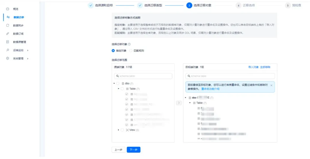 注意:Action OMS 会自动过滤无主键或非空唯一索引的表,不会显示在迁移对象中。