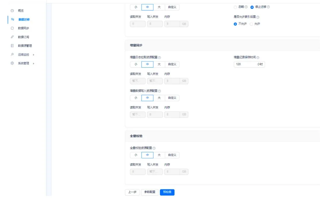 链路的参数配置根据实际环境设定即可,建议【不允许索引后置】。