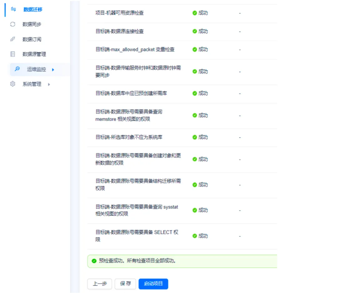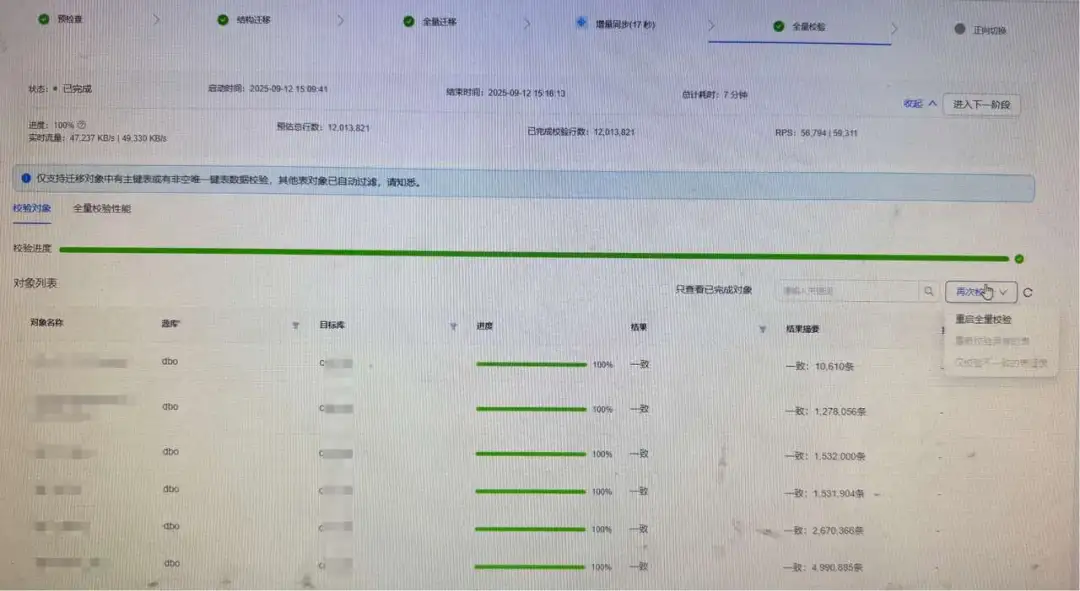 注意:因为源端生产业务在持续变更,全量迁移过程中可能会有不一致的表,可以选择再次校验、或校验不一致的表。