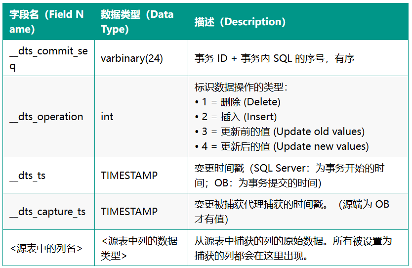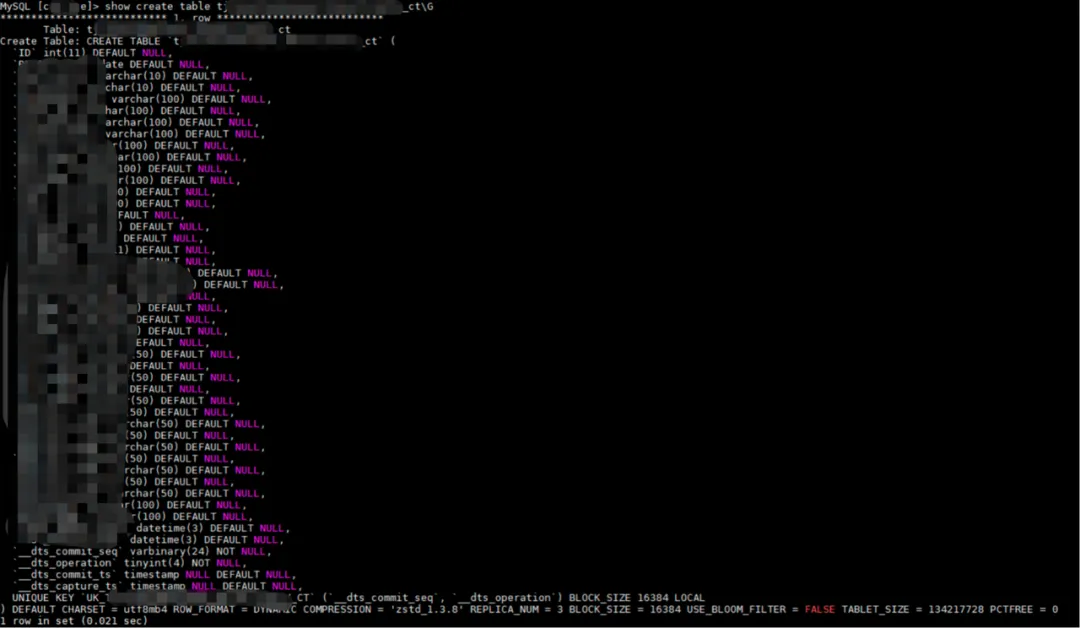 在 OceanBase(MySQL 模式)中可以看到业务表会比源端多 4 个字段,用作记录变更标识、事务提交时间等记录。