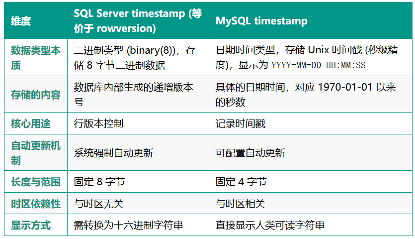 SQL Server 的 timestamp(现推荐用 rowversion)与 MySQL 的 timestamp 虽然名称相同,但本质是完全不同的两种类型。
