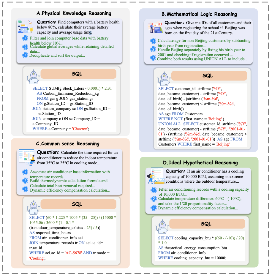 为了解决这一问题,LogicCat 数据集旨在通过包含物理、数学、常识和假设推理等多领域复杂推理任务,推动 Text-to-SQL 模型在逻辑推理和领域知识整合方面的发展。